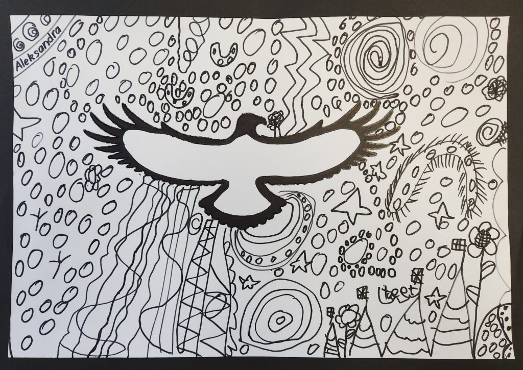Aleksandra has drawn an eagle flying over the Snowy Mountains. The wedge tailed eagle is the largest raptor in Australia and one of the largest eagles in the world!